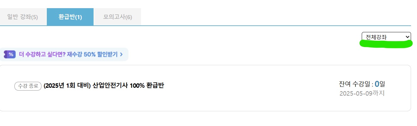 ‘전체 강좌’로 전환하면 제가 신청한 환급반 강의가 보여요. 해당 강의를 클릭해주세요!